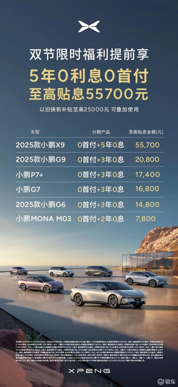 国庆假期,欢迎鹏友们前往小鹏汽车线下门店试驾,购车可享受“5年0利息0首付”双节限时福利,至高贴息55,700元。