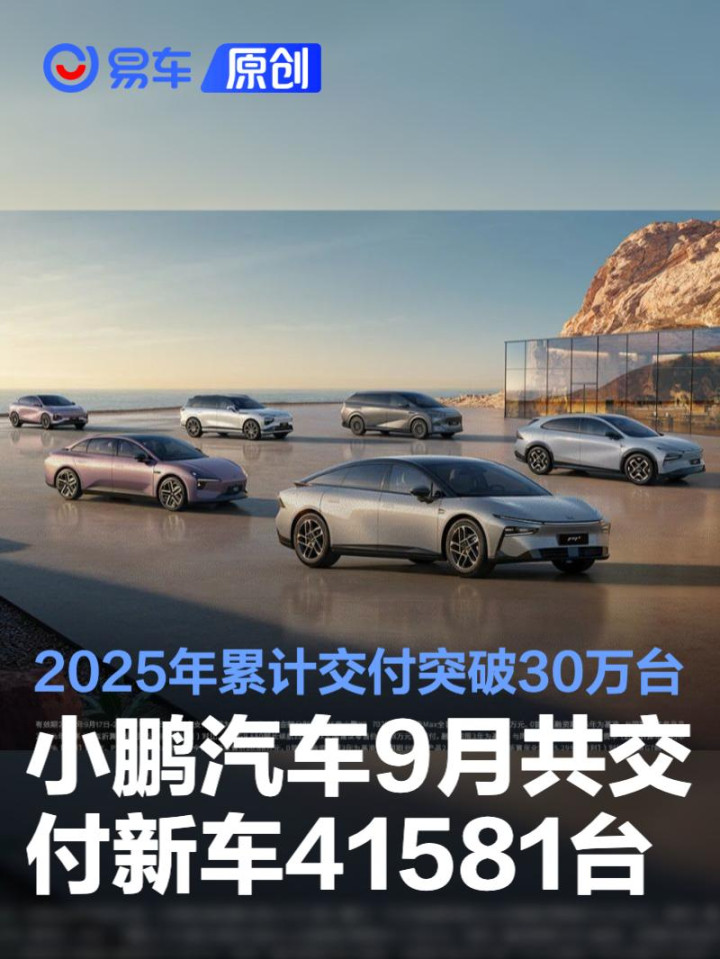 易车讯10月1日,小鹏汽车公布最新交付成绩。2025年9月,小鹏汽车共交付新车41581台,同比增长95%,环比增长10%,单月交付量突破4万台,创下历史新高。2025年1-9月,小鹏汽车累计交付新车313196台,同比增长218%。