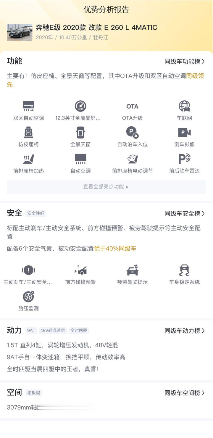 今天介绍的这辆奔驰E级 2020款 改款 E 260 L 4MATIC,车况精良,内饰豪华,配置丰富,而且售价实惠。在车况部分,除了外观、内饰功能的检测,更多买家关注的是这辆车是否为“三非”车辆,三非就是指非重大事故、非火烧、非水泡。因为事故车、泡水车、火烧车都存在较大的安全隐患。不过您放心,这辆车已经通过了事故检测、火烧检测和泡水检测,可以确定它非重大事故车、非火烧车、非泡水车。在价格方面,这辆车的售价相较于新车指导价来说,现在只需要21.98万就能拿下,性价比还是不错的。总的来说,如果您正在寻找一辆性价比高、车况良好的二手车,那么这辆奔驰E级 2020款 改款 E 260 L 4MATIC绝对是一个值得考虑的选择。
